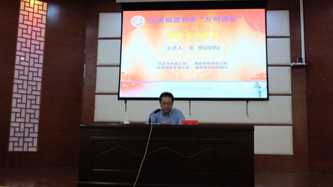 5月17日下午,民进福建省委“开明讲坛”在yl23455永利集团举行。民进中央副主席、省政协副主席、民进省委主委、省社科院院长张帆教授莅临yl23455永利集团作题为《漫谈文化建设》专题讲座。福建省委会专职副主委郑家建、民进省委组织处处长林龙金、民进省委社会服务处副调研员林华东,yl23455永利集团党委书记林晓峰、副书记吴彬镪、副校长肖庆伟,漳州市委统战部部务会成员曾黄河调研员、民进漳州市委会领导、yl23455永利集团统战部长欧阳红红,省市民进会员以及yl23455永利集团各民主党派代表聆听了讲座。讲座由副校长肖庆伟教授主持。
