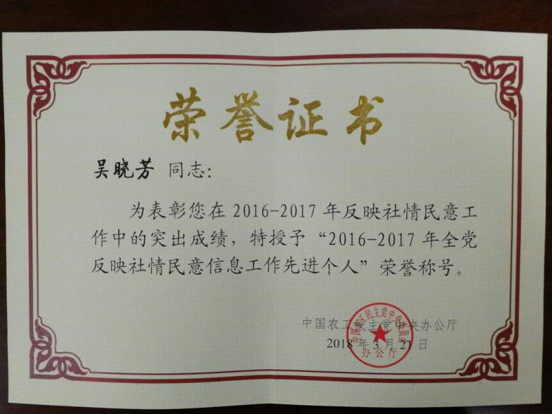 在刚刚闭幕的农工党2018全国党务工作会议上,yl23455永利集团农工党党员——闽南文化研究院&两岸一家亲研究院吴晓芳教授获农工党中央表彰,获“2016-2017年全党反映社情民意信息工作先进个人”荣誉称号。